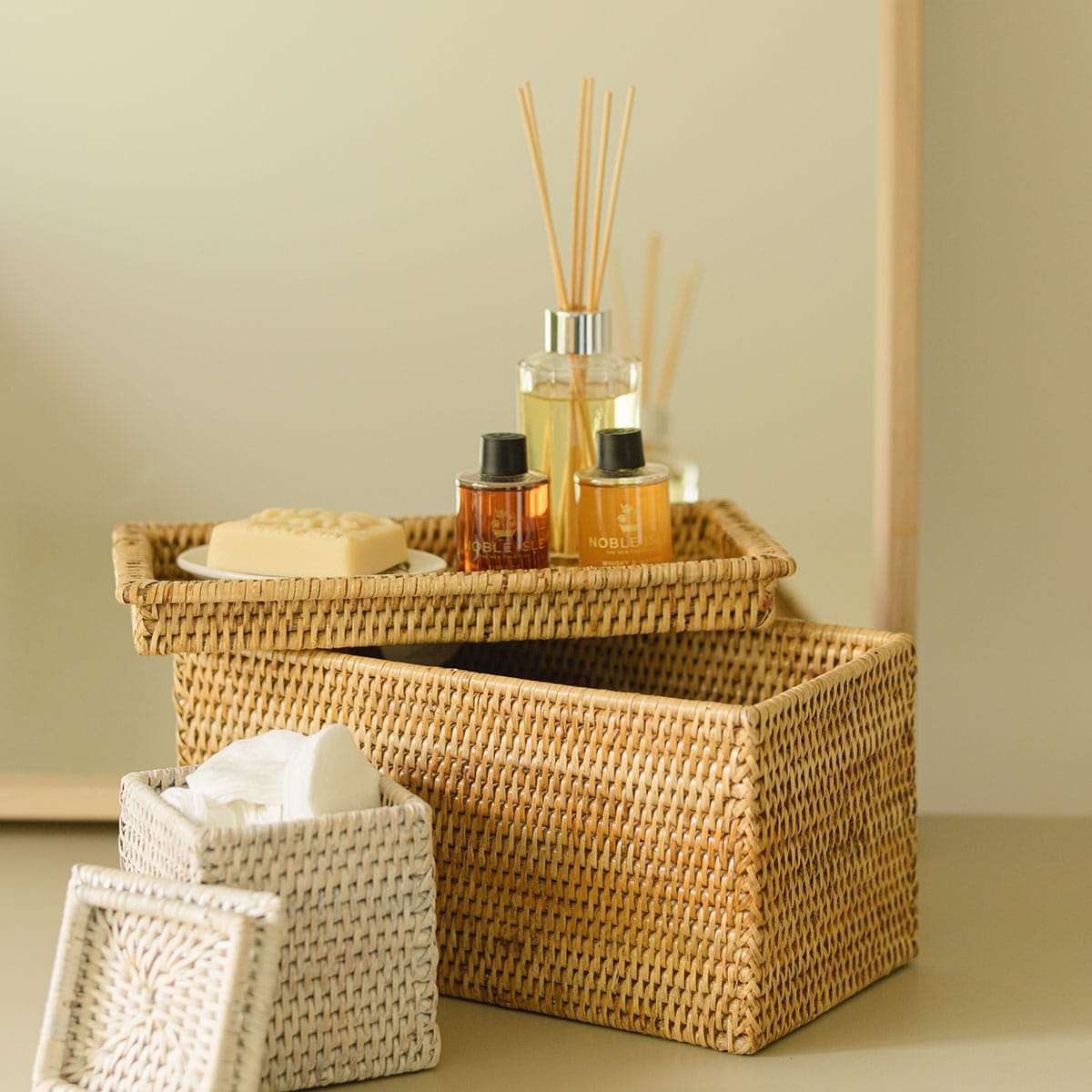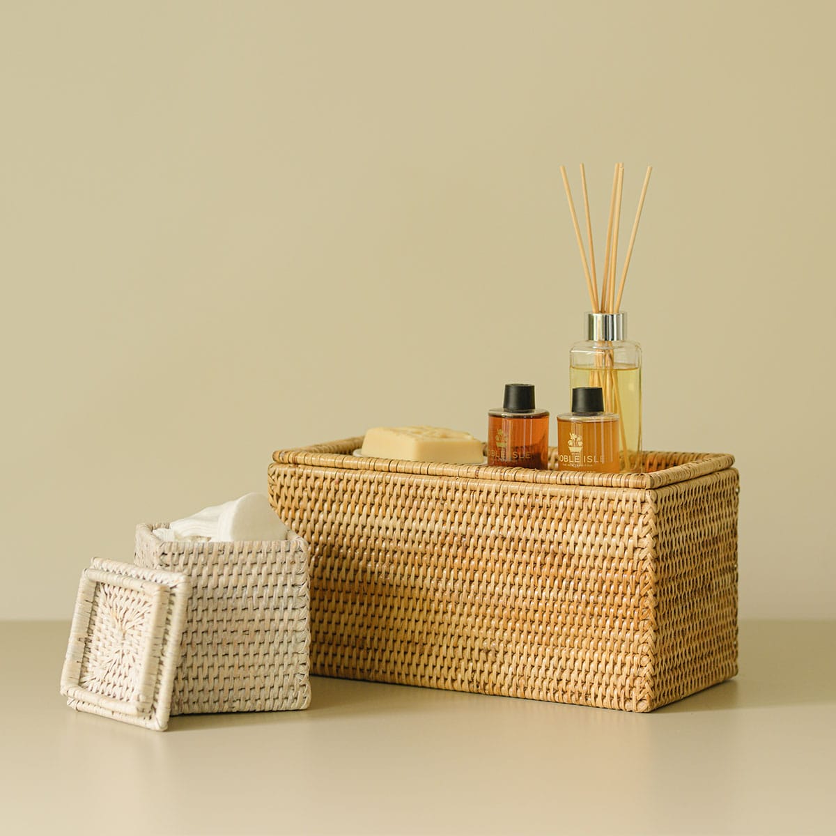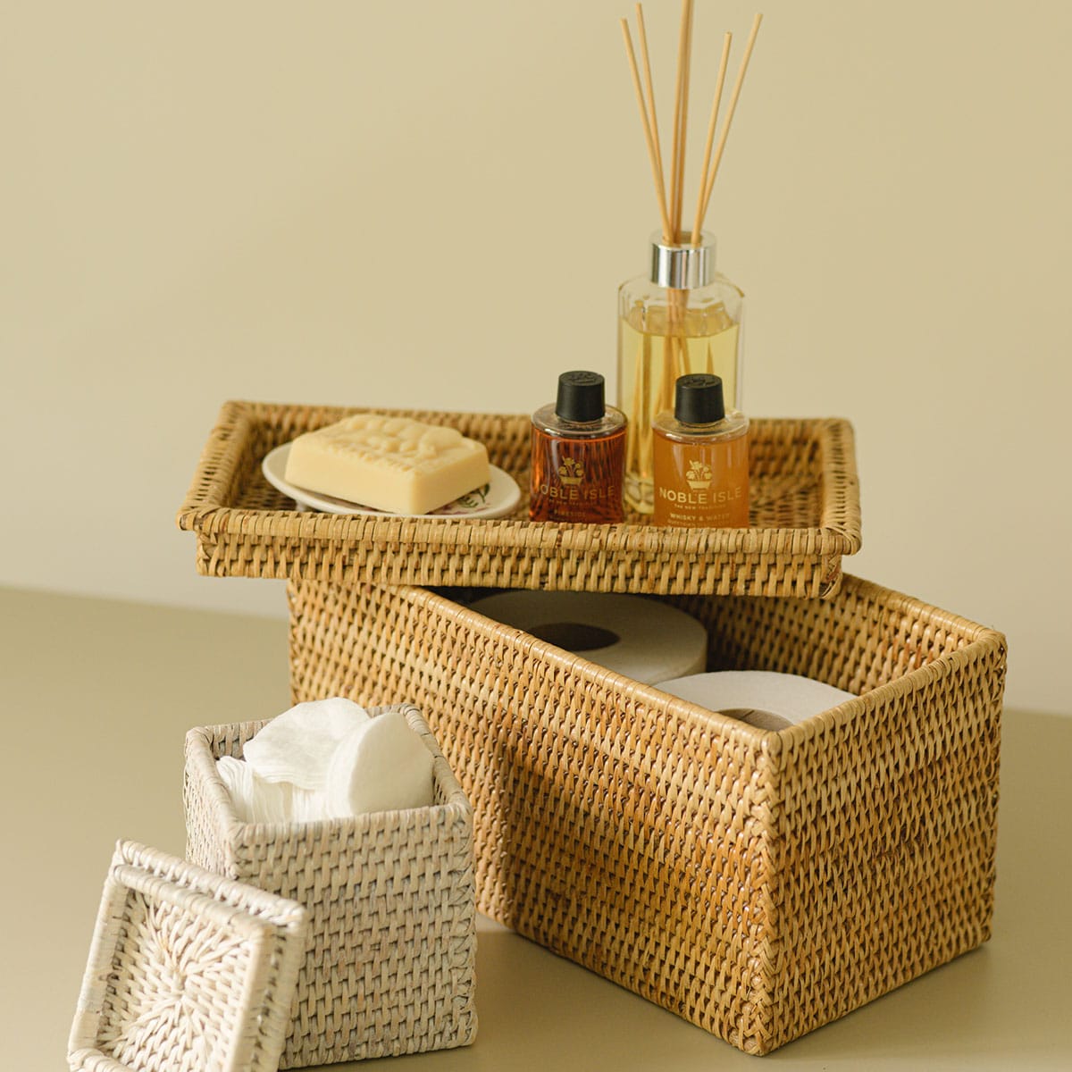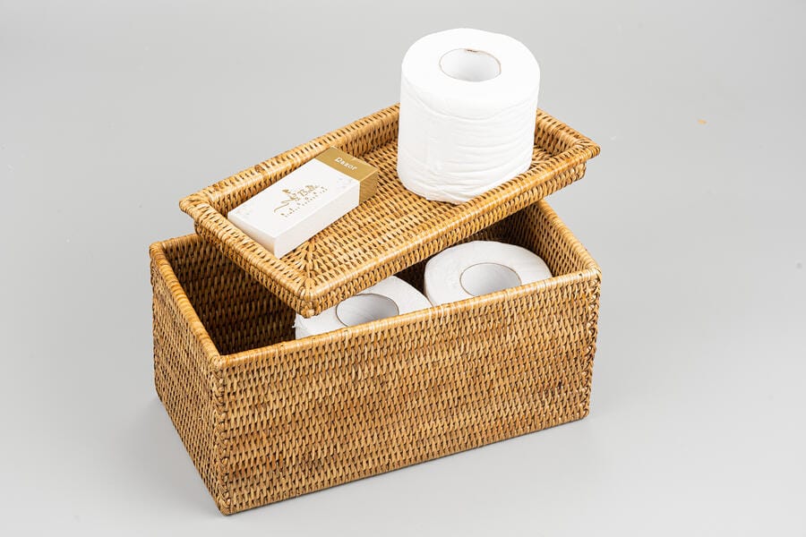 Transform your bathroom into a spa-like sanctuary with this elegant two-tier organiser that maximises vertical space beautifully. Our skilled Myanmar artisans hand-weave each level using natural rattan and traditional techniques, creating distinct compartments for toiletries, cosmetics, and bath essentials. The compact footprint suits small spaces whilst the tiered design provides generous storage capacity. The breathable rattan naturally resists moisture whilst adding warm, organic texture to bathroom décor. Perfect for vanity tops, beside bathtubs, or in linen cupboards. Gentle variations in the weave pattern reflect authentic handcrafted character.